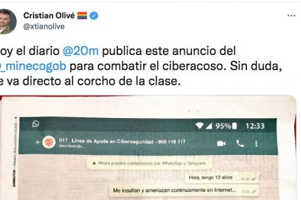 El docente ha compartido en su perfil un anuncio contra el ciberacoso publicado por el Ministerio de Asuntos Económicos y Transformación Digital en el periódico 20 Minutos.