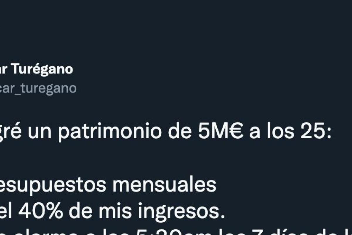 El consultor inmobiliario Óscar Turégano (@oscar_turegano) ha publicado en su cuenta de Twitter los cinco pasos que debes seguir para lograr “un patrimonio de cinco millones de euros a los 25 años”, pero tirando de mucha ironía.