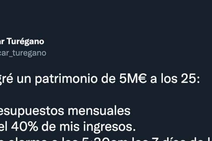 El experto explica en su publicación que para lograr un patrimonio como el suyo de cinco millones de euros a los 25 años necesitas hacer presupuestos mensuales, ahorrar el 40% de los ingresos que tengas y automatizar tus operaciones.