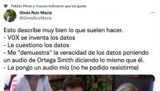 Cuando el edil de Podemos le dijo que se había inventado el dato, Antelo le puso un audio del Secretario General de Vox, Javier Ortega Smith, para refutarlo. La reacción de Ruiz Maciá, poner otro audio con su voz diciendo que ese dato era falso, ha sido aplaudida por millones de personas en Twitter.