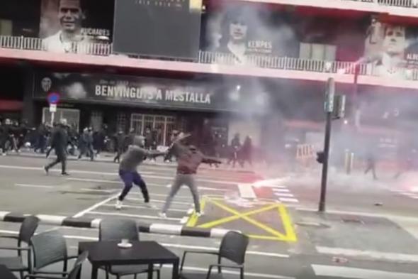 En las imágenes se podía comprobar cómo los implicados se golpeaban con puñetazos y palos, se lanzaban conos de plástico y bengalas que han causado humaredas y también las mesas y las sillas de los bares que estaban abiertos junto al estadio.