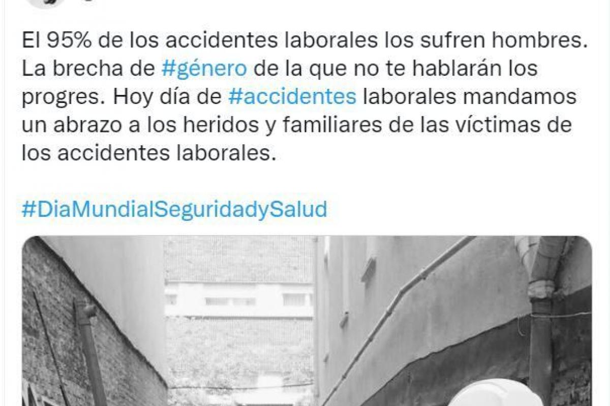 “El 95% de los accidentes laborales los sufren hombres. La brecha de #género de la que no te hablarán los progres”, ha escrito antes de añadir: “Hoy día de #accidentes laborales mandamos un abrazo a los heridos y familiares de las víctimas de los accidentes laborales”.