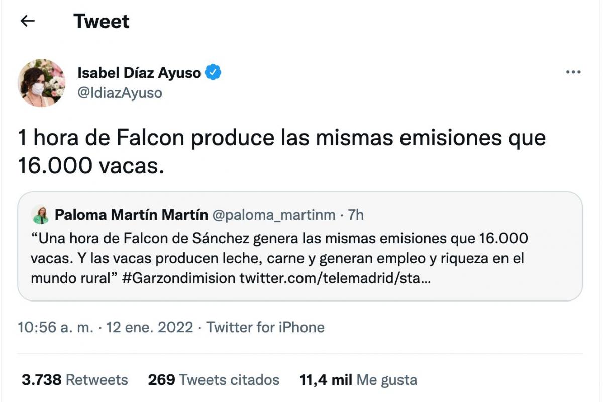 “1 hora de Falcon produce las mismas emisiones que 16.000 vacas”, ha escrito la presidenta de la Comunidad de Madrid en respuesta a otro tuit de su consejera de Medioambiente Paloma Martín.