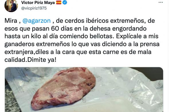 “Mira , @agarzon , de cerdos ibéricos extremeños, de esos que pasan 60 días en la dehesa engordando hasta un kilo al día comiendo bellotas. Explícale a mis ganaderos extremeños lo que vas diciendo a la prensa extranjera, diles a la cara que esta carne es de mala calidad. Dimite ya!”, ha afirmado en un tuit Píriz.