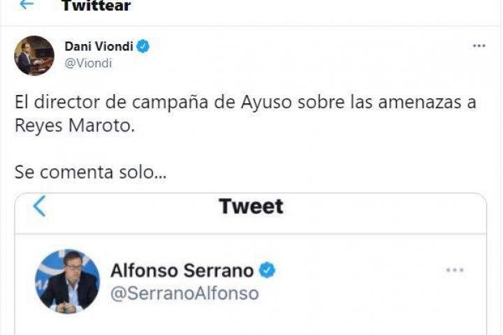 El diputado del PSOE Daniel Viondi ha cargado contra Alfonso Serrano, diputado del PP en la Asamblea de Madrid y jefe de campaña de Isabel Díaz Ayuso, por el tuit que ha publicado después de que la Policía haya identificado al autor de las amenazas a la ministra Reyes Maroto.