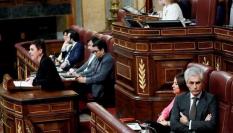 Gabriel Rufián (ERC) se abre paso ante la ministra de Economía en funciones, Nadia Calviño, y Mikel Legarda, del PNV.