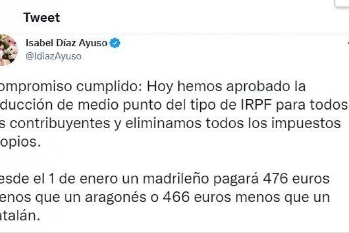 En un tuit, la dirigente del PP ha escrito: “Compromiso cumplido: Hoy hemos aprobado la reducción de medio punto del tipo de IRPF para todos los contribuyentes y eliminamos todos los impuestos propios”.