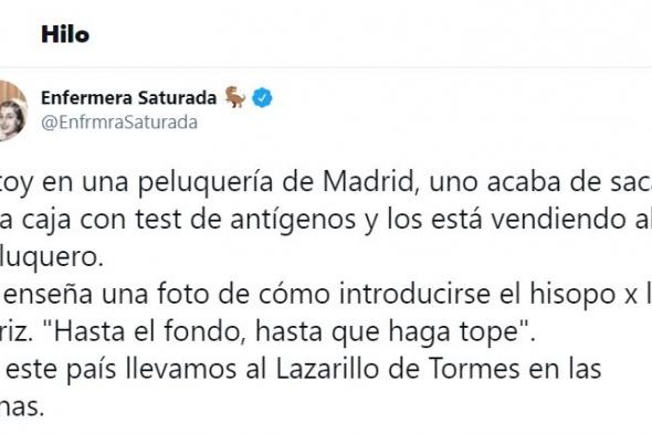 “Estoy en una peluquería de Madrid, uno acaba de sacar una caja con test de antígenos y los está vendiendo al peluquero”, ha comentado Enfermera Saturada en Twitter.