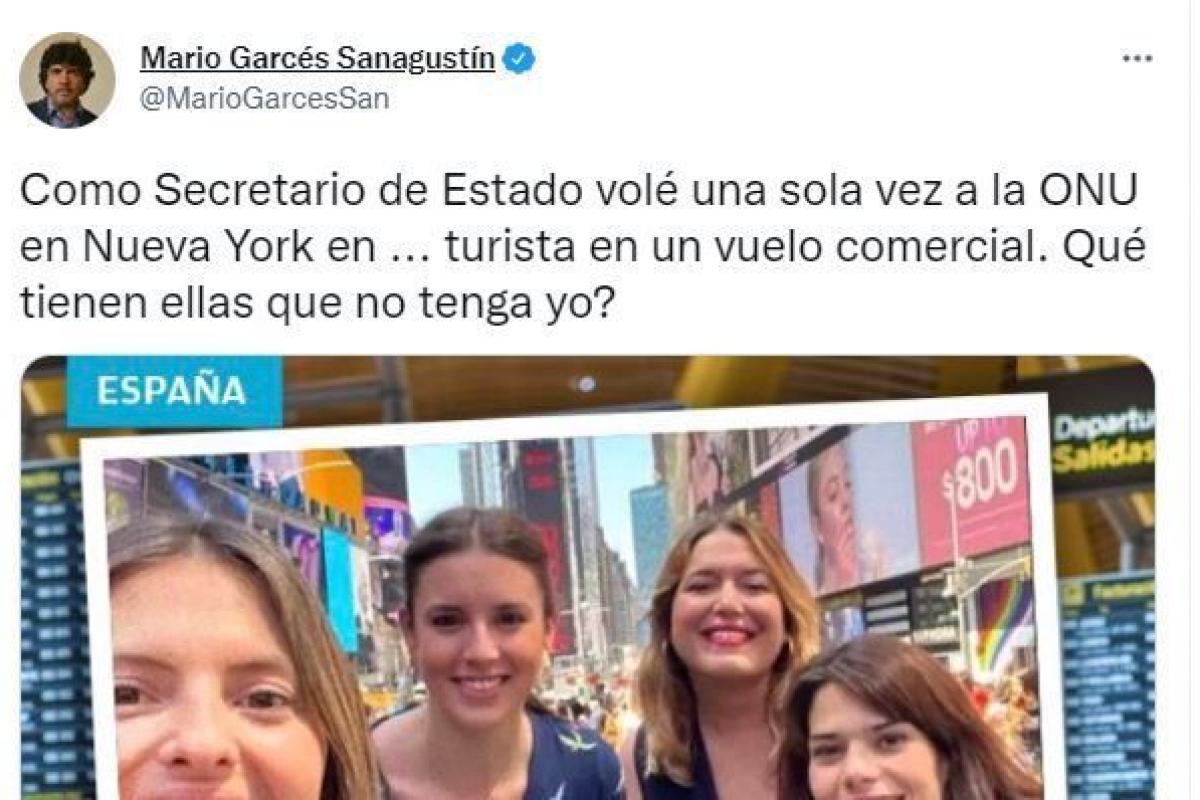 “Como Secretario de Estado volé una sola vez a la ONU en Nueva York en ... turista en un vuelo comercial. Qué tienen ellas que no tenga yo?”, ha escrito el diputado ‘popular’ junto a una noticia en la que se asegura Montero y su equipo viajaron en Falcon a Estados Unidos “a pesar de tener siete vuelos comerciales”.
