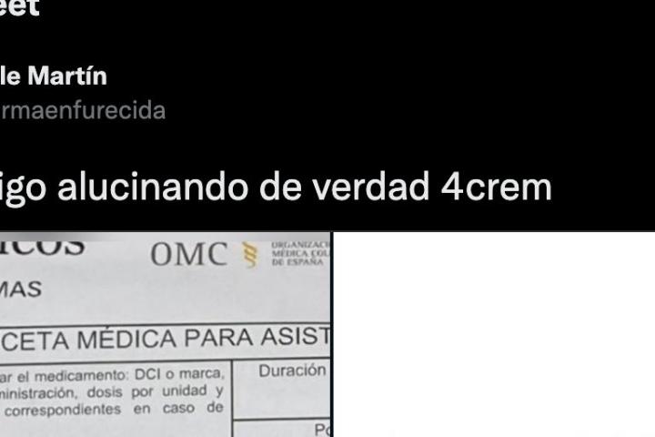 “Es que sigo alucinando de verdad 4crem”, ha escrito en la publicación, que supera los 1.500 me gusta. Juntos a estas palabras ha mostrado la receta, en la que difícilmente se puede ver lo que el farmacéutico ha interpretado como “4crem” y una imagen del medicamento, cuyo nombre es cuatrocrem.