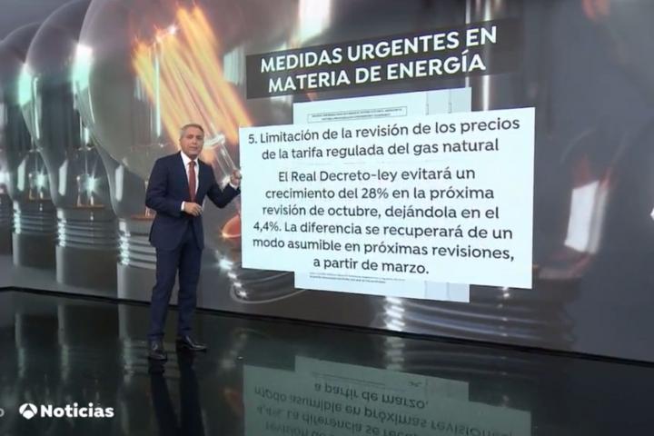 El periodista ha desgranado el documento del Ministerio de Transición Ecológica y ha comentado: “En el punto quinto, sobre la limitación de la revisión de los precios de la tarifa regulada del gas natural, se dice que el decreto evitará el crecimiento del 28% en la revisión del próximo mes de octubre, dejándola en el 4%”.