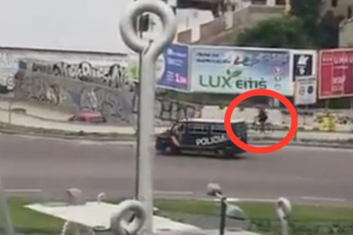 La Policía Nacional ha compartido en su cuenta oficial de Twitter un vídeo en el que se ve a un ciclista huyendo de un furgón policial por las calles de Valencia.
