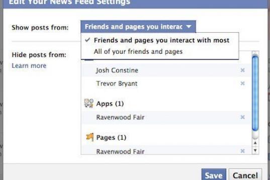Facebook permite que sus miembros decidan que quieren ver más o menos un tipo de contenido en su suministro de noticias. Pueden elegir también preferencias con respecto a sus amigos.