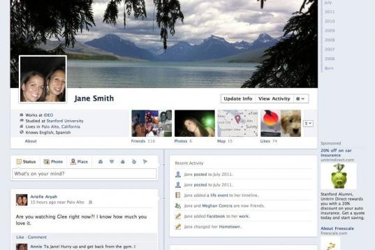 El muro o tablón de Facebook se convierte en una línea de tiempo. El perfil se organiza por fecha, con una línea para ir hacia atrás en el tiempo y mostrar información acerca de la vida de un usuario... antes de que se uniera a Facebook.
