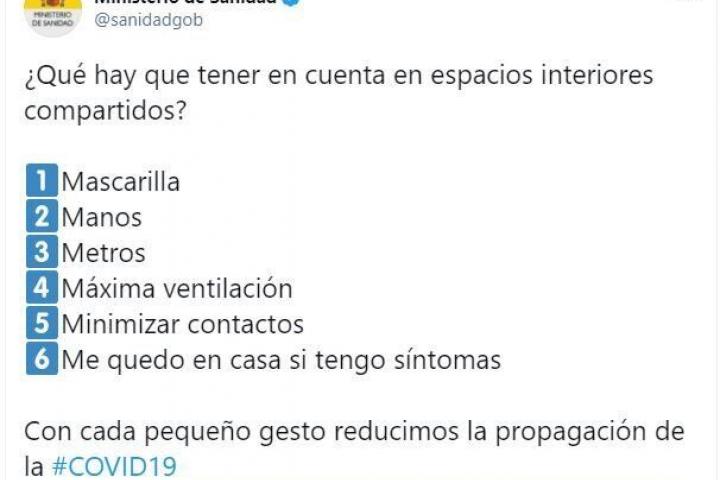 En un tuit, el departamento que dirige Salvador Illa ha escrito que hay seis puntos a tener muy en cuenta cuando estemos en espacios interiores compartidos. Se trata de las ya famosas ‘6 M’: Mascarilla, higiene de Manos, Metros de distancia, Máxima ventilación, Minimizar contactos y Me quedo en casa si tengo síntomas.