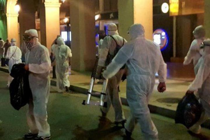 Los miembros de la brigada han actuado con la ayuda de grandes escaleras y vestidos con monos de papel de color blanco que les tapaban la cabeza y con mascarillas y gafas industriales que les cubrían el rostro, según ha podido comprobar Efe.
