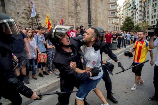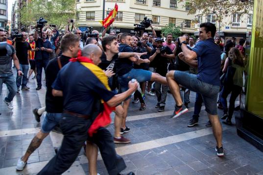 Y el nuevo epicentro del desencuentro -pasando de los gritos a las manos- es Valencia. La Policía Local y la Nacional han tenido que intervenir en la concentración convocada a las seis de esta tarde por la llamada Comisión 9 d'Octubre -integrada por Acció Cultural del País Valencià, PSOE, Compromís, Podemos, UGT y CCOO, entre otras entidades-. La cita, pacífica, ha sido boicoteada minutos antes de su inicio por grupos de simpatizantes e integrantes de Yomus, el grupo ultra del Valencia CF, que según informa el diario Las Provincias ha acudido a la misma plaza donde estaban los izquierdistas, la de San Agustín, con banderas de España y senyeras. Entonces es cuando ha habido un cruce de reproces, al parecer, y "la policía ha tenido que intervenir separando a ambos colectivos, que han acabado en lados opuestos de la plaza para evitar accidentes", señala el rotativo. La jornada del 9 d'Octubre es el día grande de la Comunitat Valenciana, de ahí el simbolismo de la marcha convocada para esta tarde.