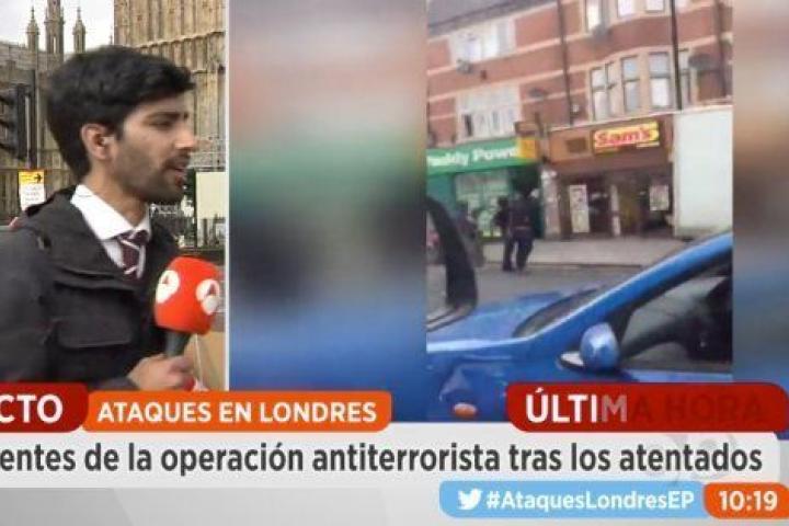 El periodista hablaba de cómo podría afectar el atentado a las elecciones británicas, que se celebran el próximo jueves. En un momento dado, el reportero mira hacia otro lado ante la estupefacción de la presentadora desde el plató. "Ha caído un hombre al agua", repite Vélez.