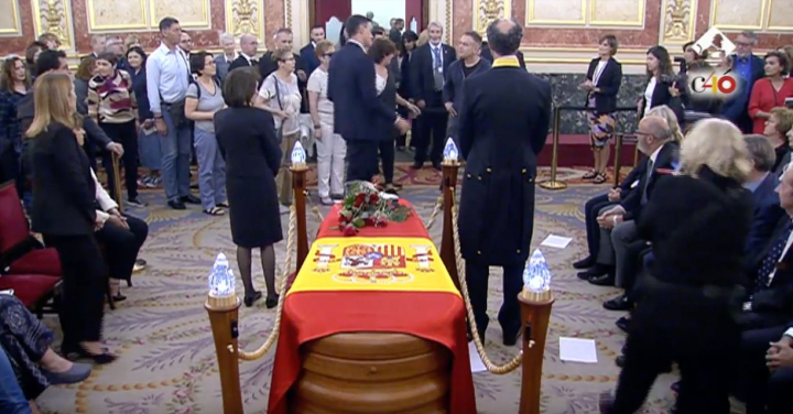 Un hombre ha lanzado varios papeles sobre el féretro de Alfredo Pérez Rubalcaba durante la capilla ardiente que se ha instalado en el Congreso de los Diputados.