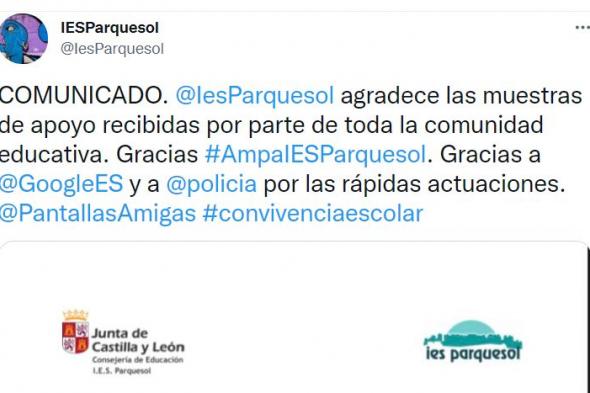 “El IES Parquesol agradece las muestras de apoyo recibidas por parte de toda la comunidad educativa y da las gracias a Google España y a la Policía Nacional por las rápidas actuaciones”, concluye el instituto en su comunicado.