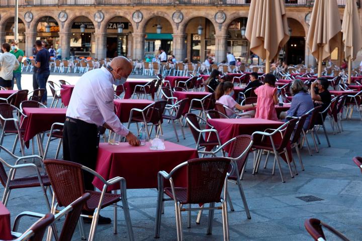 Un camarero trabaja en la terraza de un restaurante de la plaza mayor de Salamanca.EFE