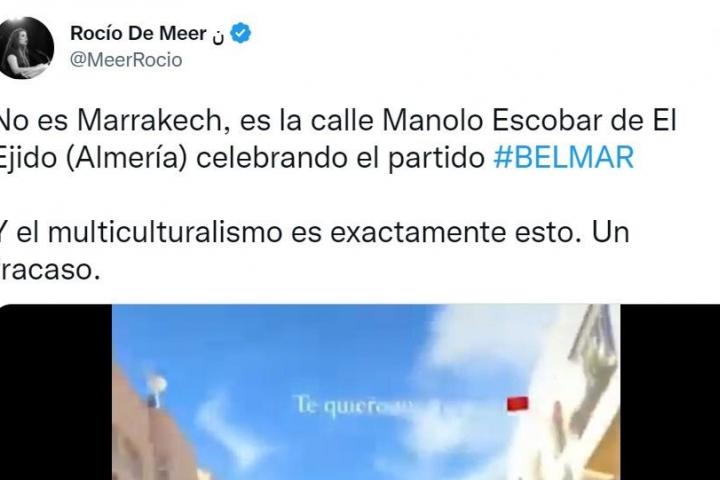 “No es Marrakech, es la calle Manolo Escobar de El Ejido (Almería) celebrando el partido entre Bélgica y Marruecos. Y el multiculturalismo es exactamente esto. Un fracaso”, aseguró De Meer.