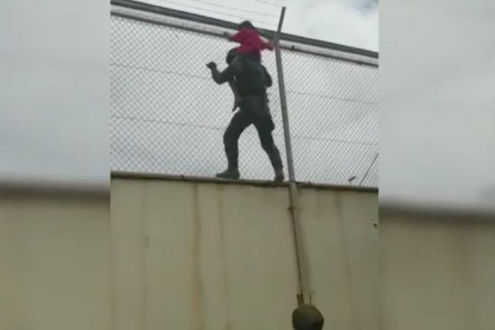 En uno de los saltos a la valla de El Tarajal, un niño quedó atrapado encaramado en lo alto. Un grupo de legionarios vieron al menor y actuaron. En el vídeo, que se ha difundido en las redes este miércoles, se ve como un legionario sube y, con el pequeño en sus hombres, lo rescata.