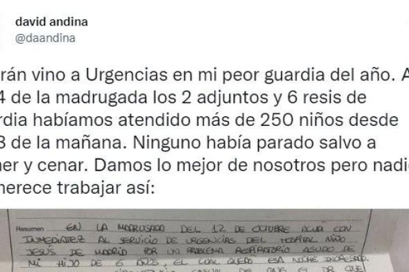 El pediatra de Urgencias del hospital Niño Jesús de Madrid David Andina ha compartido en su cuenta de Twitter la carta que le escribió una madre después de atender a su hijo. El sanitario también ha reflexionado sobre las condiciones en las que trabajó.