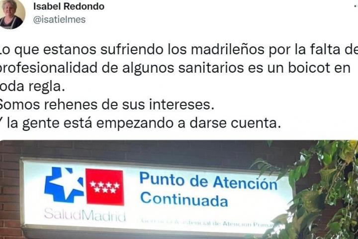 “Lo que estamos sufriendo los madrileños por la falta de profesionalidad de algunos sanitarios es un boicot en toda regla. Somos rehenes de sus intereses. Y la gente está empezando a darse cuenta”, afirmó.