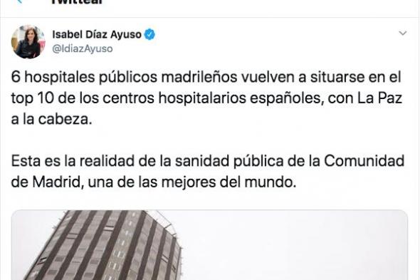La presidenta de la Comunidad de Madrid, Isabel Díaz Ayuso, ha utilizado ese informe para sacar pecho en Twitter. “Esta es la realidad de la sanidad pública de la Comunidad de Madrid, una de las mejores del mundo”, ha escrito.