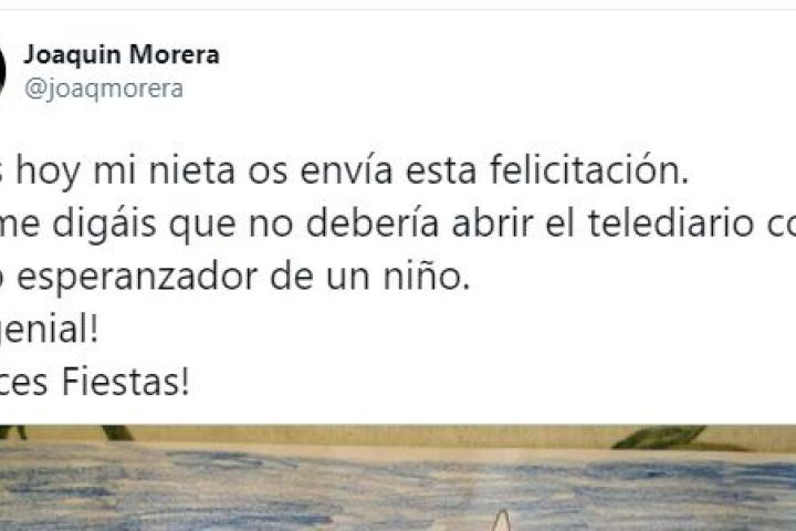 “Pues hoy mi nieta os envía esta felicitación. No me digáis que no debería abrir el telediario como grito esperanzador de un niño. ¡Es genial!”, ha dicho en su perfil de la red social.
