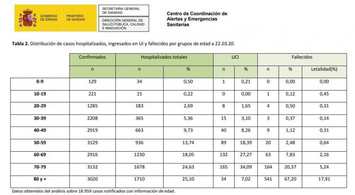 Mucha gente lo llevaba pidiendo desde hace tiempo y, por fin, este domingo, 22 de marzo, el Ministerio de Sanidad publicó las cifras de casos de coronavirus por franjas de edad. En la tabla difundida por el Centro de Coordinación de Alertas y Emergencias Sanitarias se incluye el número de hospitalizaciones, ingresos en UCI y fallecimientos sobre un grupo de 18.959 casos registrados, del total de los 28.752 detectados en España.