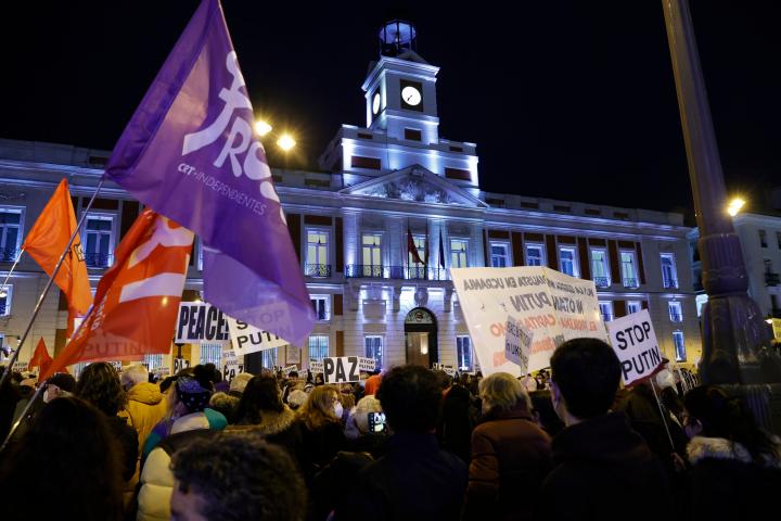 Un millar de personas, según la Delegación del Gobierno, se han concentrado este viernes en la madrileña puerta de Sol contra la invasión de Ucrania por parte de Rusia, en una convocatoria, bajo el lema “Ni Putin ni OTAN”, en la que los manifestantes han reclamado el fin de la guerra y han cuestionado el papel de la Alianza Atlántica en el conflicto.