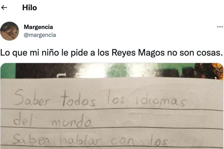 “Lo que mi niño le pide a los Reyes Magos no son cosas”, pone @Margencia en un tuit que supera en muy pocas horas los 6.500 ‘me gusta’ y llega a casi 1.000 compartidos entre retuits y citados.