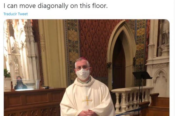 El religioso, que tiene más de 6.000 seguidores en su perfil de Twitter, subió una imagen en la que se le ve con mascarilla sobre el suelo de una iglesia, compuesto por baldosas cuadradas negras y blancas, como si fuera un tablero de ajedrez o de las damas.