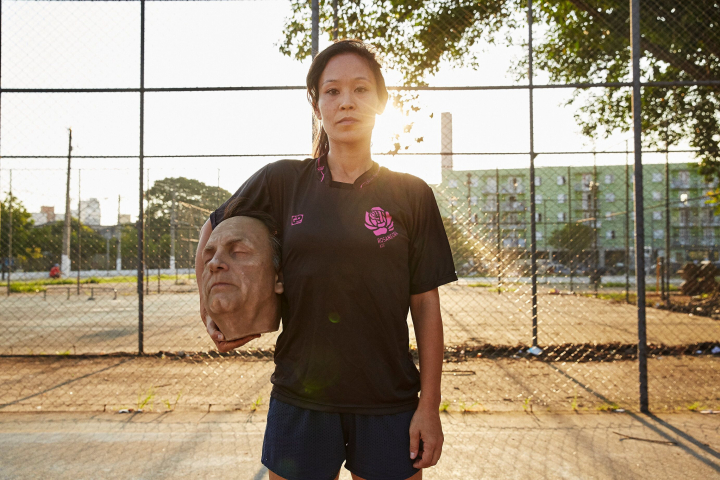 Unas escaleras. Un mural callejero que ocupa las distintas paredes. Sao Paulo. En el plano, ocupando toda la pantalla, los graffiti con la cara de la activista feminista y LGTB Marielle Franco, asesinada en 2018, y que se definía a sí misma como una “mujer feminista, negra e hija de la favela”. El resto de los mensajes en las paredes dicen “Mujer negra, artista, resista”. Todos hacen referencia a Franco. Son dibujos de varias artistas que le han puesto el nombre de Franco a la escalera para no olvidar a la activista lesbiana. Sentada en el centro, en unos peldaños, una chica racializada, con la cara pixelada y pelo afro, mira un vídeo y niega con la cabeza. Se levanta, se sube a su patín y recorre las calles hasta un cementerio donde recoge una bolsa negra con algo dentro: la cabeza de Bolsonaro, que lleva hasta una cancha en una zona urbana y donde comienza un partido de fútbol con la cabeza como balón.
