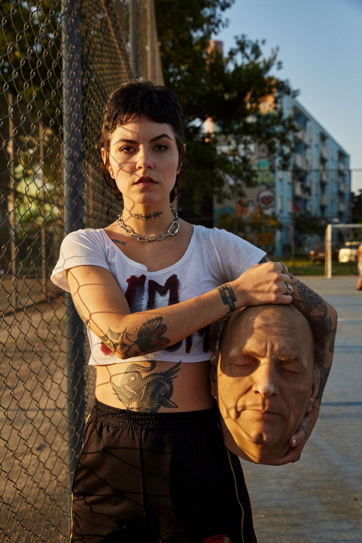 Otra de las jugadoras alude a la genealogía feminista como ejercicio activista con unas grandes letras de “SCUM” en su camiseta. Tchaka Drag Queen juega con la cabeza en medio de un ambiente festivo y reivindicativo, vestida de gala, con vivos colores. La celebración es también activismo. Contra la opresión, color y juego.