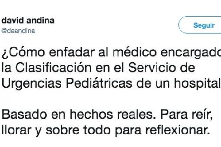 El pediatra de Urgencias David Andina (@daandina) ha narrado en Twitter las situaciones más surrealistas a las que se tiene que enfrentar en su día a día. El médico ha pretendido con su hilo que la sociedad reflexione sobre sus visitas al hospital.