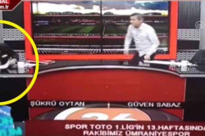 Los espectadores de la cadena de televisión turca 26 se quedaron helados al ver lo que ocurrió en directo mientras el veterano periodista deportivo Sukru Oytan comentaba un partido junto a otro compañero.