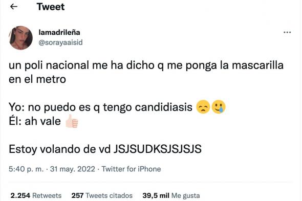Más de 100 comentarios, más de 2.500 retuits entre compartidos y citados y casi 40.000 ‘me gusta’ lleva la usuaria de Twitter @Sorayaaisid al contar lo que le ha pasado en el Metro de Madrid.