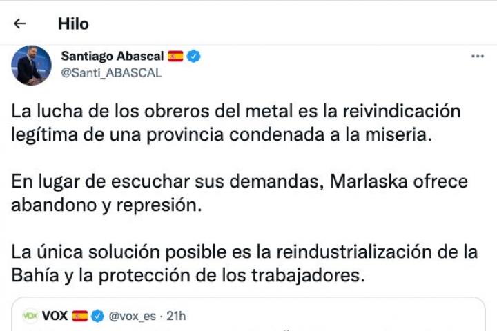 “La lucha de los obreros del metal es la reivindicación legítima de una provincia condenada a la miseria”, escribió Abascal antes de añadir: “En lugar de escuchar sus demandas, Marlaska ofrece abandono y represión”.