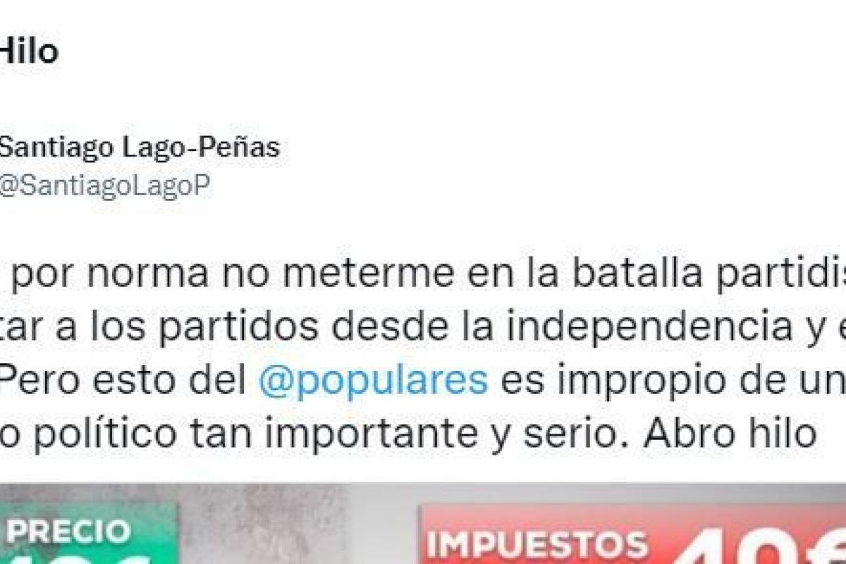 El experto comienza asegurando en una serie de mensajes de Twitter que tiene por norma no meterse “en la batalla partidista y respetar a los partidos desde la independencia y el rigor”. “Pero esto del PP es impropio de un partido político tan importante y serio”, subraya.