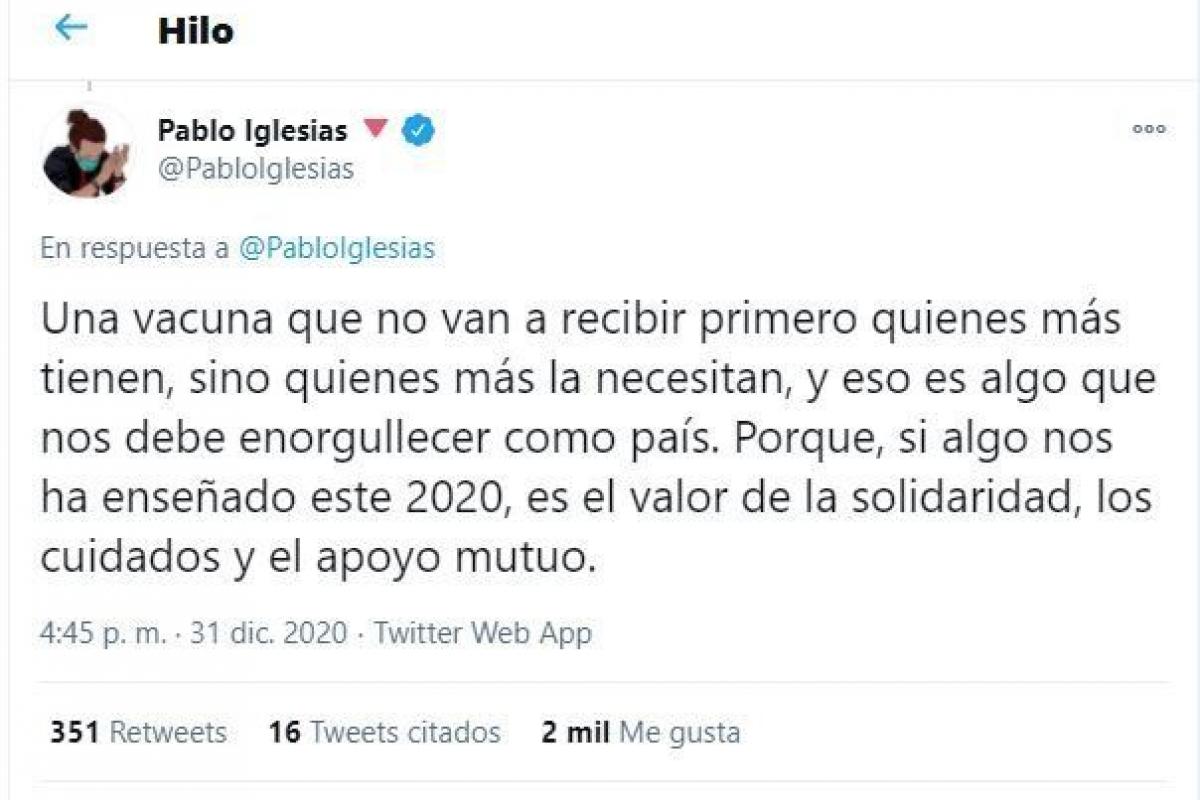 En un hilo de mensajes en Twitter, el también líder de Podemos hacía balance de 2020, “un año muy duro, seguramente el más duro de nuestra época”. “Un año que nos ha puesto a prueba como sociedad, con una pandemia mundial de dimensiones desconocidas que ha provocado un enorme sufrimiento”, decía.
