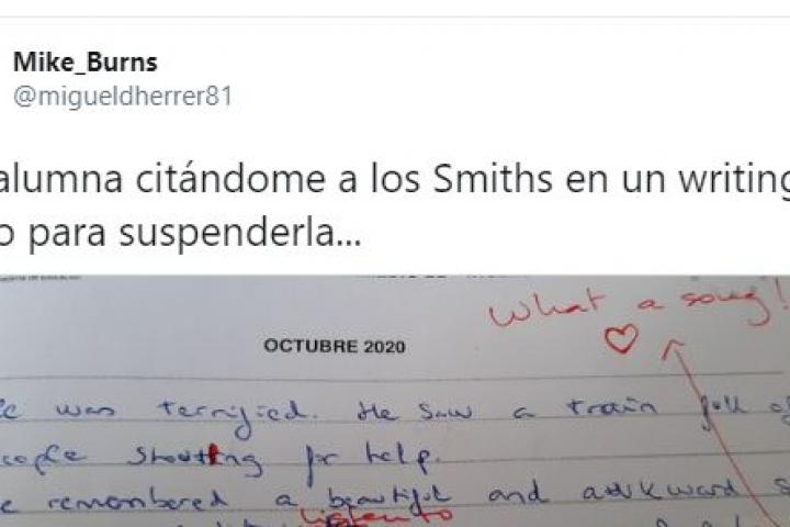 “Una alumna citándome a The Smiths en un writing. Como para suspenderla...”, escribió en Twitter el profesor. De hecho, el docente, redactor de la revista de música MondoSonoro, ha redondeado la canción en la corrección y le ha puesto un corazón.
