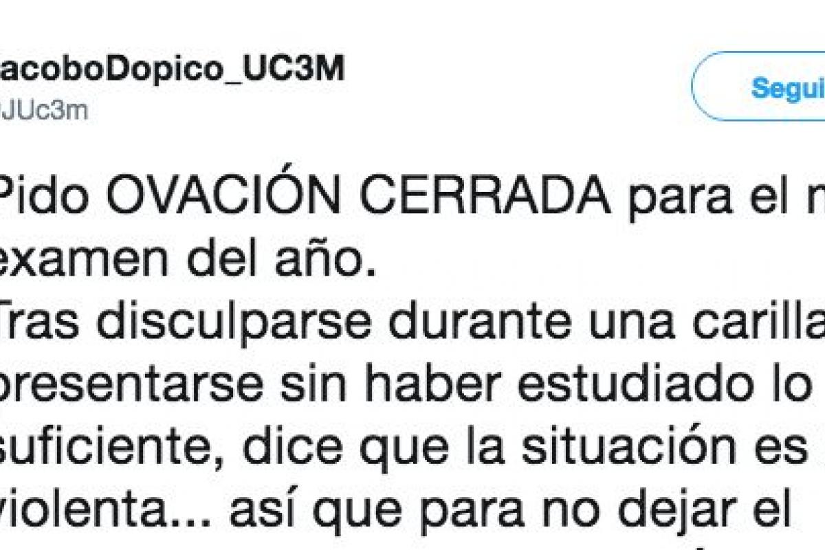 “Pido ovación cerrada para el mejor examen del año. Tras disculparse durante una carilla por presentarse sin haber estudiado lo suficiente, dice que la situación es muy violenta... Así que para no dejar el examen en blanco me contará el motín de Aranjuez de 1808. Y me lo cuenta”, publicó.