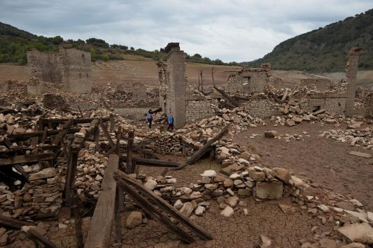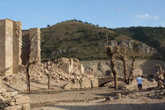 La falta de lluvia de los últimos meses ha provocado que el embalse riojano de Mansilla, a 72 kilómetros de Logroño (La Rioja), se encuentre más bajo que nunca, apenas al 14,7% de su capacidad. La sequía ha sacado a la luz un pueblo sumergido bajo sus aguas desde 1960.