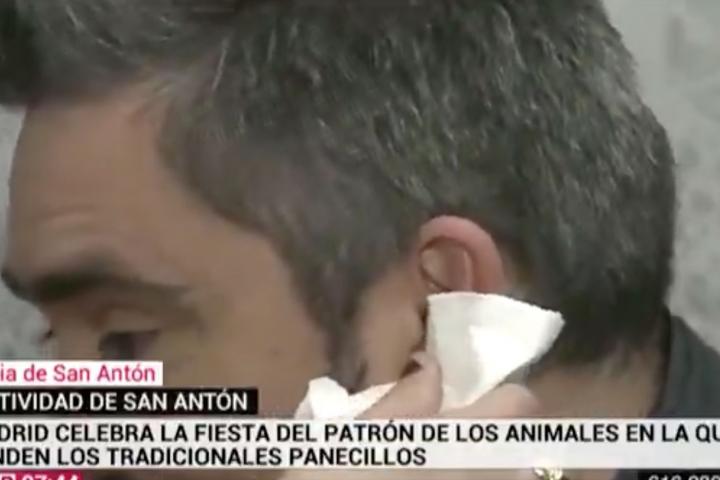 José Antonio Masegosa, reportero de Telemadrid, ha protagonizado una curiosa imagen en pleno directo en el programa Buenos Días Madrid de la cadena pública madrileña durante un directo desde la Iglesia de San Antón, con motivo de la festividad del patrón de los animales.