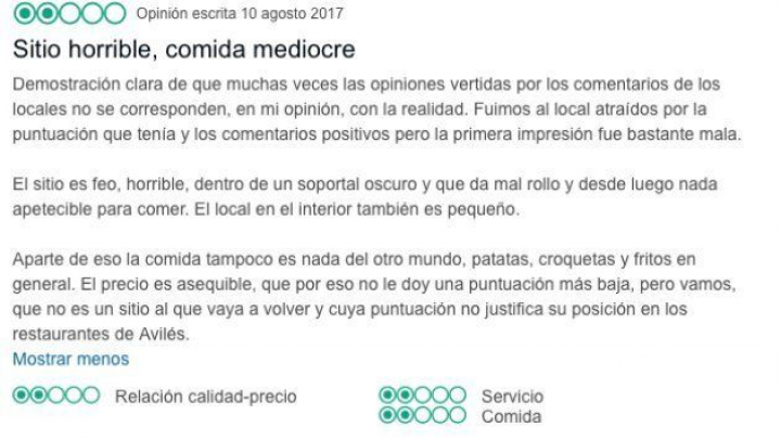 Pero el cliente en cuestión no se deja impresionar por eso, titula su comentario como "sitio horrible, comida mediocre" y subraya que este restaurante es una "demostración clara de que muchas veces las opiniones vertidas por los comentarios de los locales no se corresponden con la realidad".