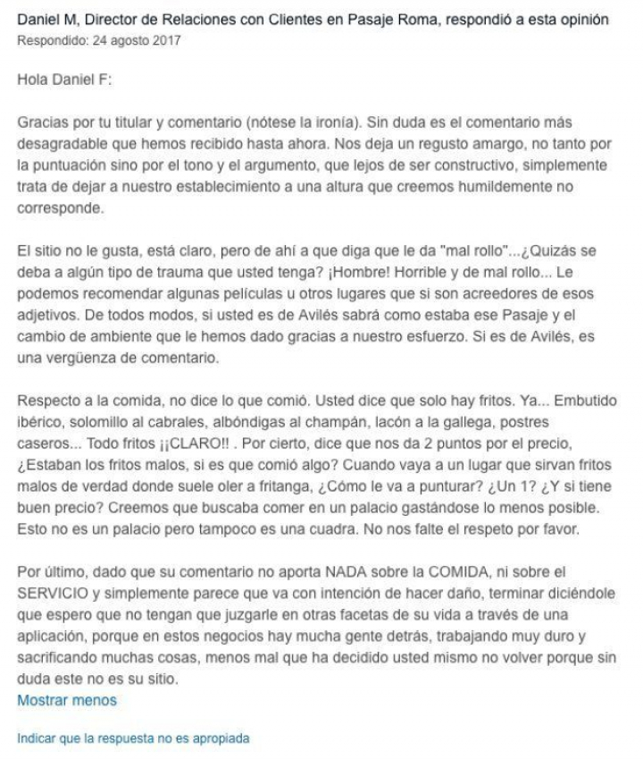 El último ejemplo lo ha dado el restaurante Pasaje Roma de Avilés (Asturias). A finales de agosto replicó a un cliente que había dado una baja puntuación al negocio y ahora esa respuesta ha triunfado gracias a que la ha publicado el diario local El Comercio,donde se ha convertido en la noticia más leída de este martes. Otros periódicos como ABC también la han replicado.