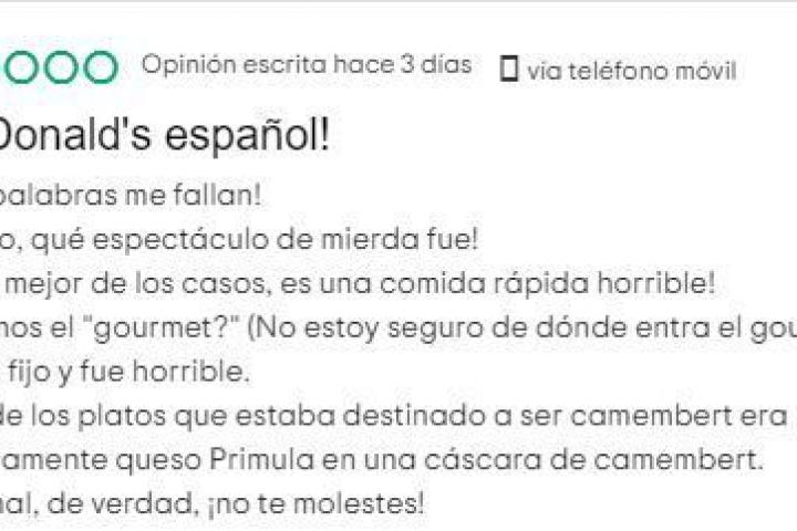 Como ejemplo, la reseña que un usuario ha dejado recientemente en esta última web y en la que califica al negocio como un “McDonalds español”. El cliente dice que no volverá jamás al restaurante y afirma que su visita fue un “espectáculo de mierda” que “en el mejor de los casos” se puede calificar de “comida rápida horrible”.